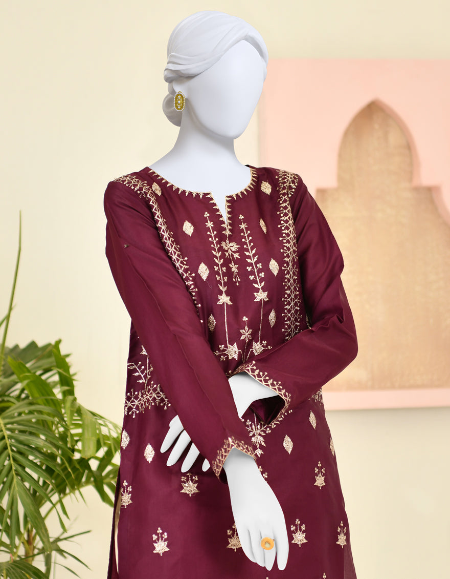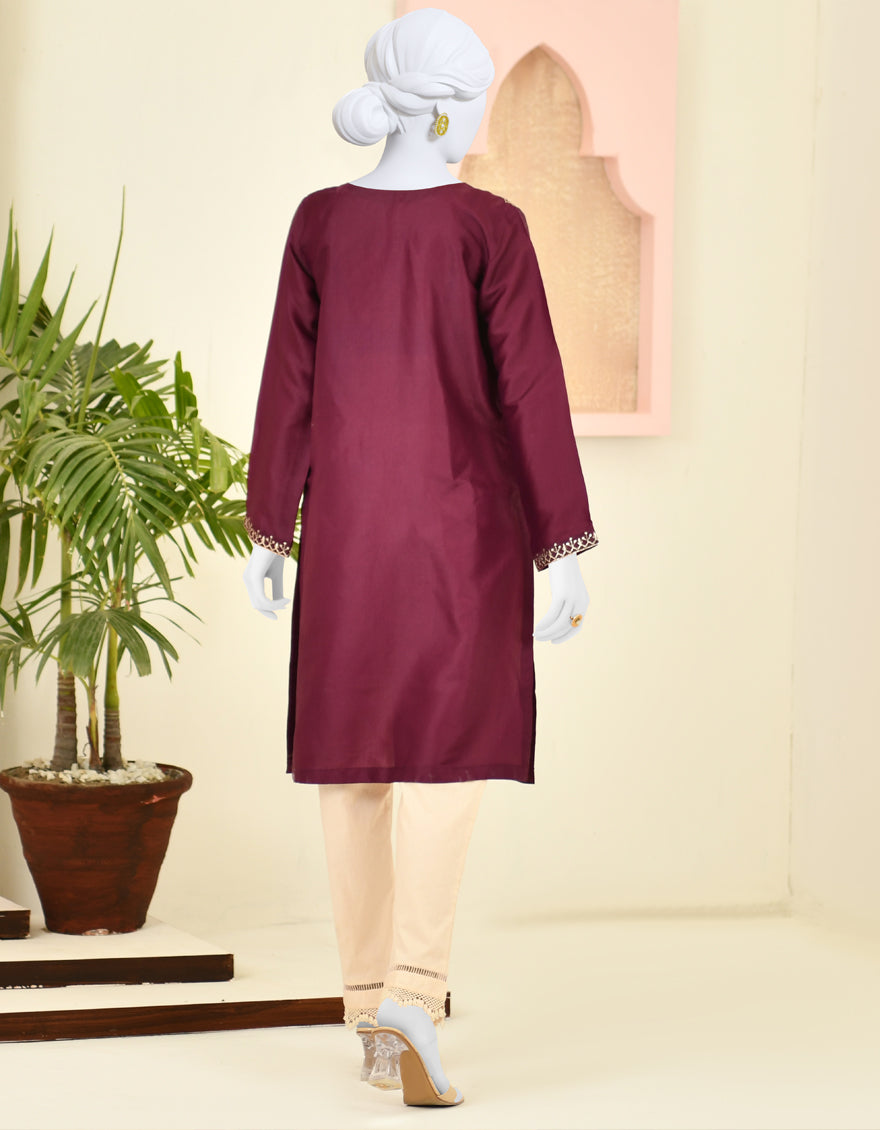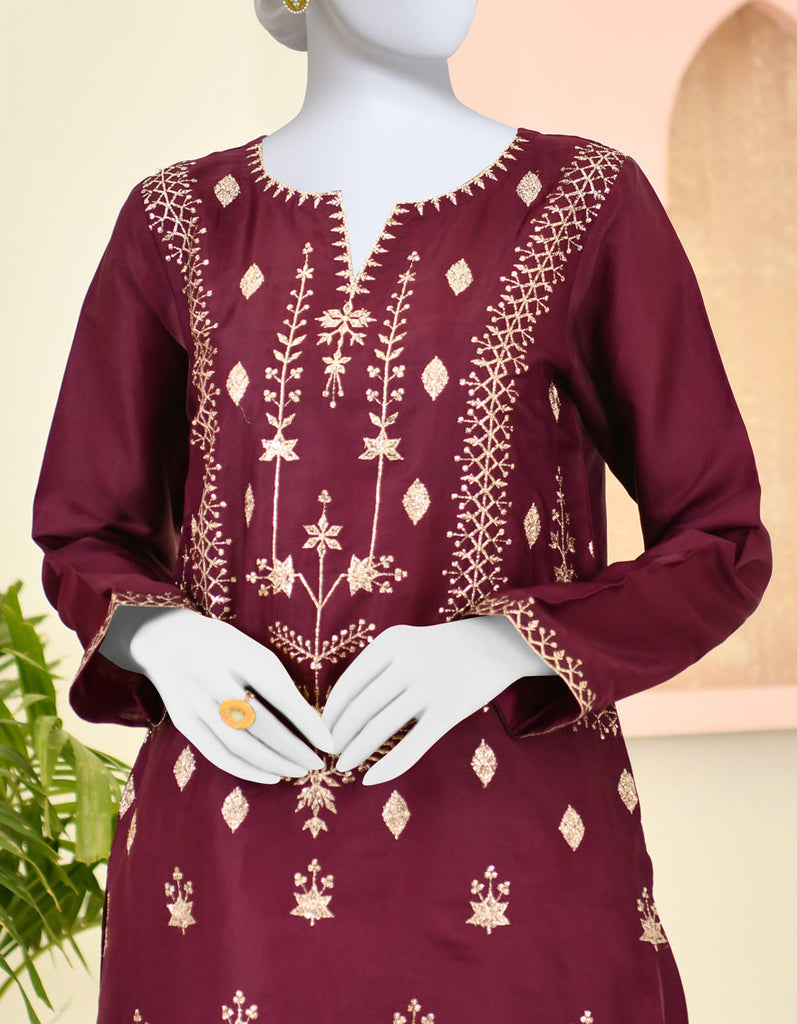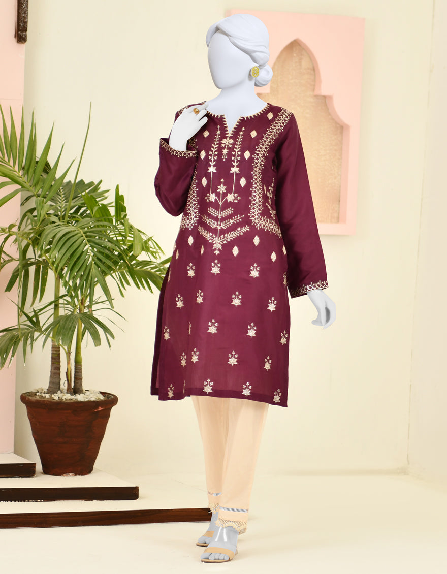 Description: Plum Color Kurti With Rose Gold Badla Embroidery On Front And Sleeves Borders.