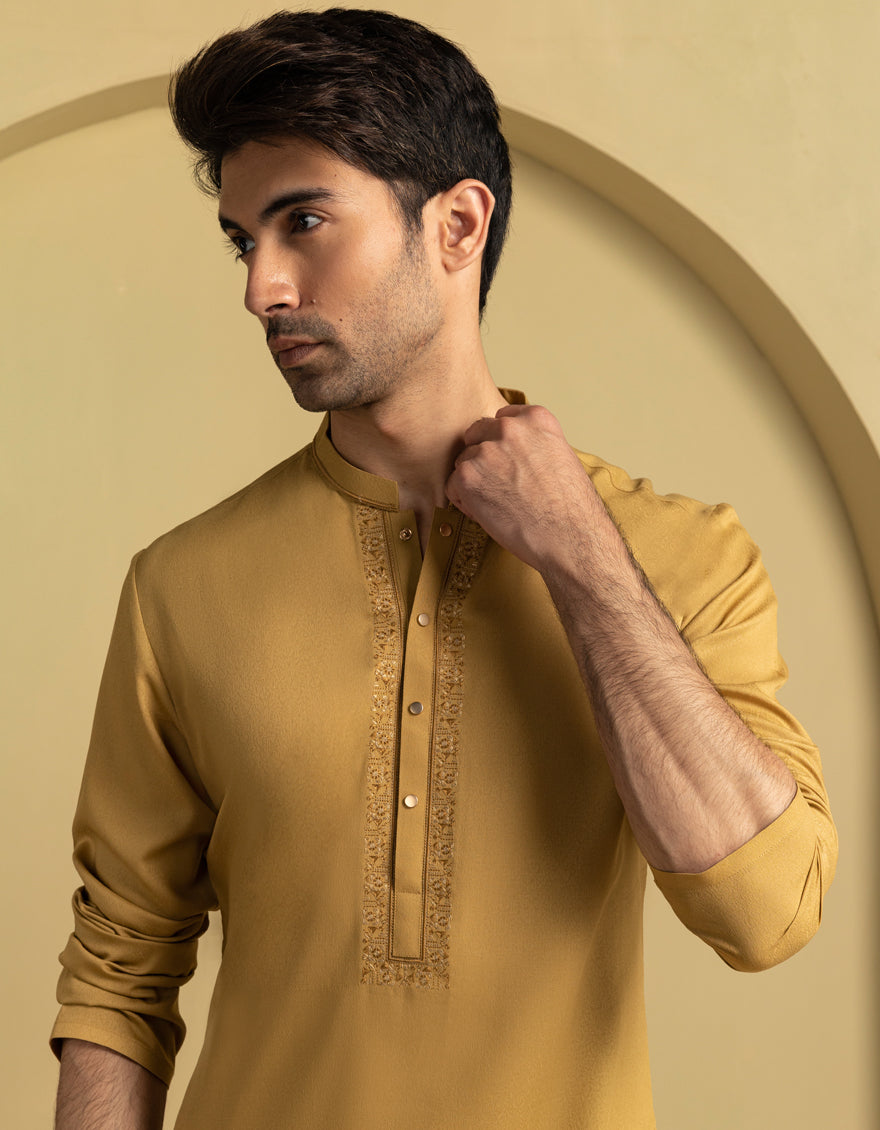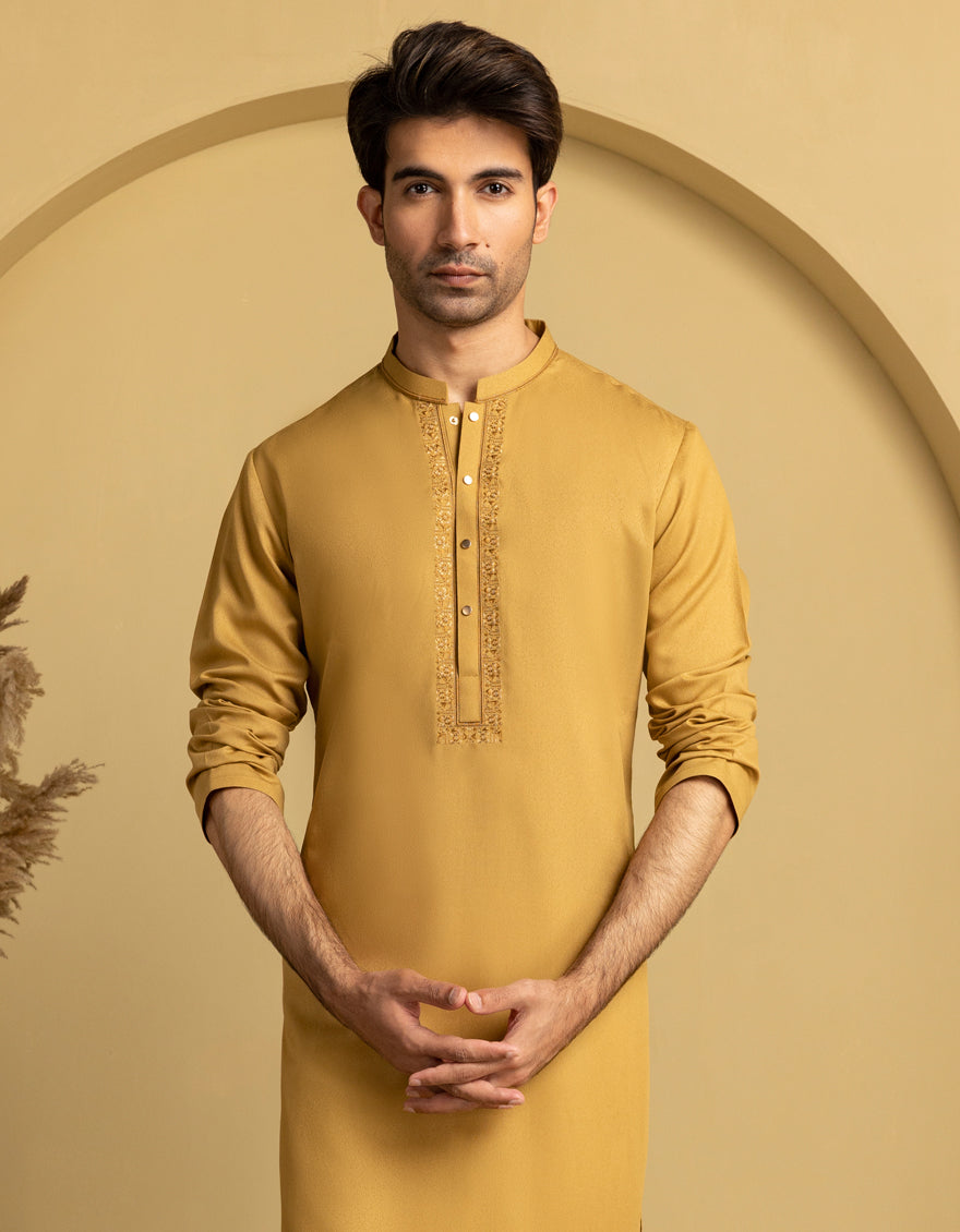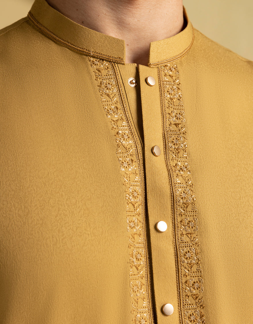 Upgrade your look with this Mustard Blended Semi-Formal Kurta, which mixes traditional and modern styles for a classy yet comfortable outfit.