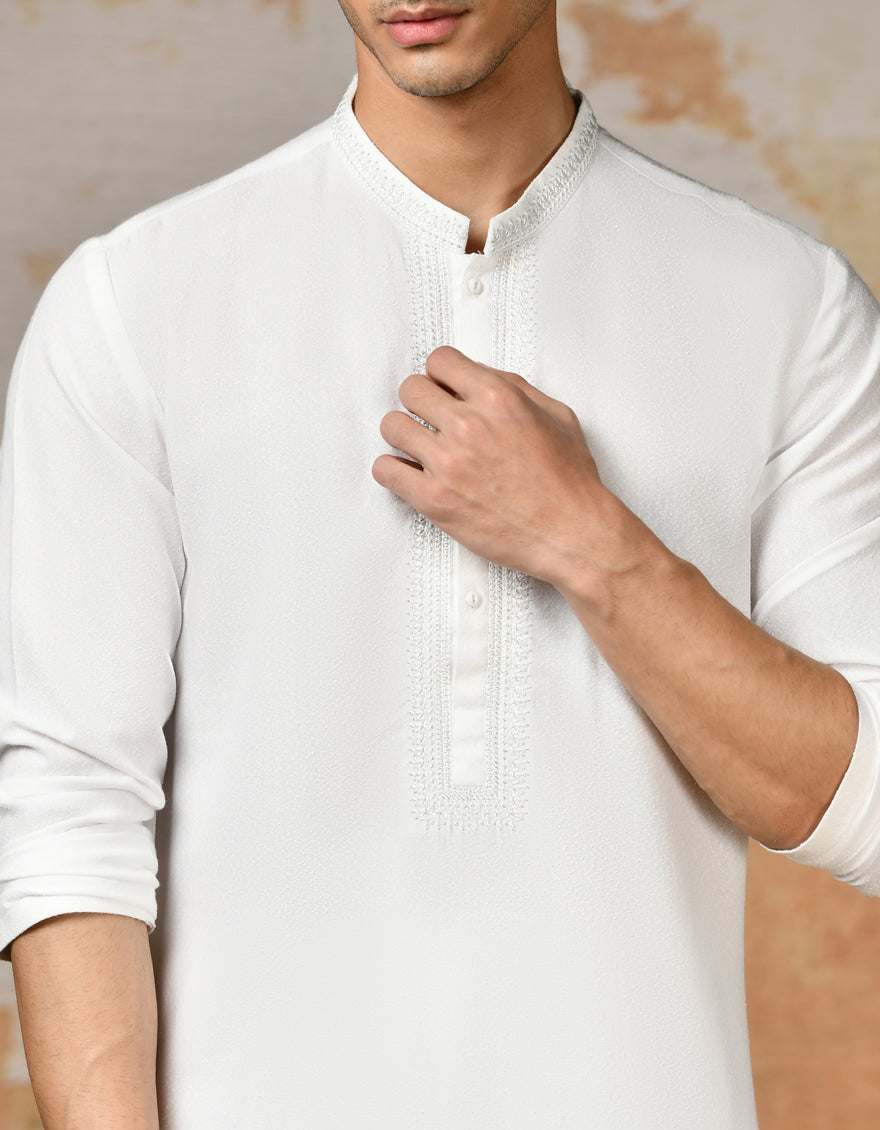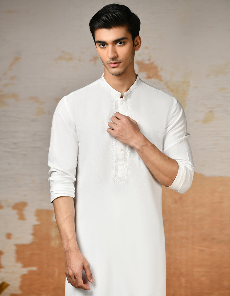 This men's white blended formal kameez shalwar epitomizes traditional charm and modern sophistication featuring timeless designs exquisite fabrics and meticulous craftsmanship perfect for adding a touch of cultural refinement to any occasion.