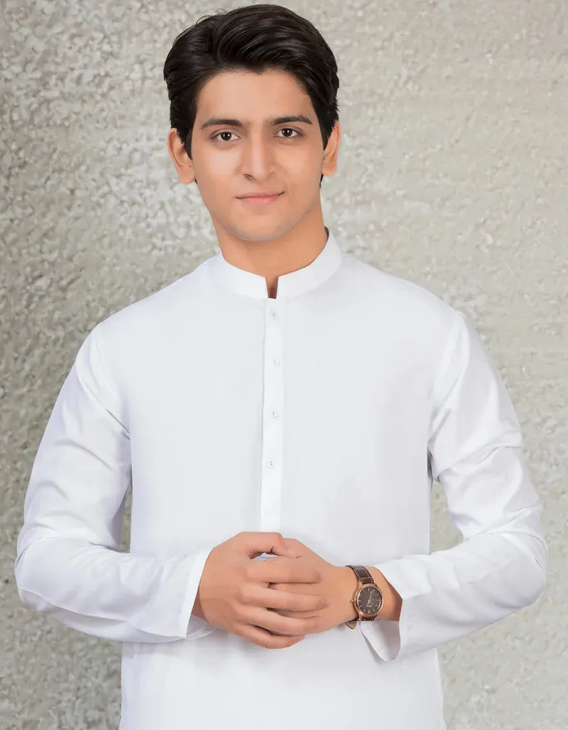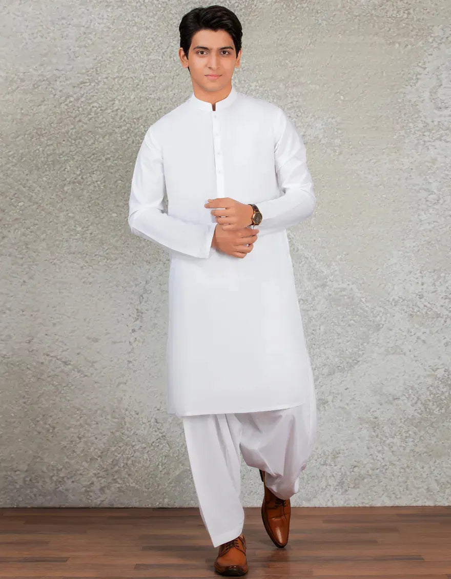 Explore our latest teen boys' white blended casual kameez shalwar, designed with a blend of classic simplicity and Eastern charm. This oufit offer a stylish yet understated look, suitable for a variety of occasions.