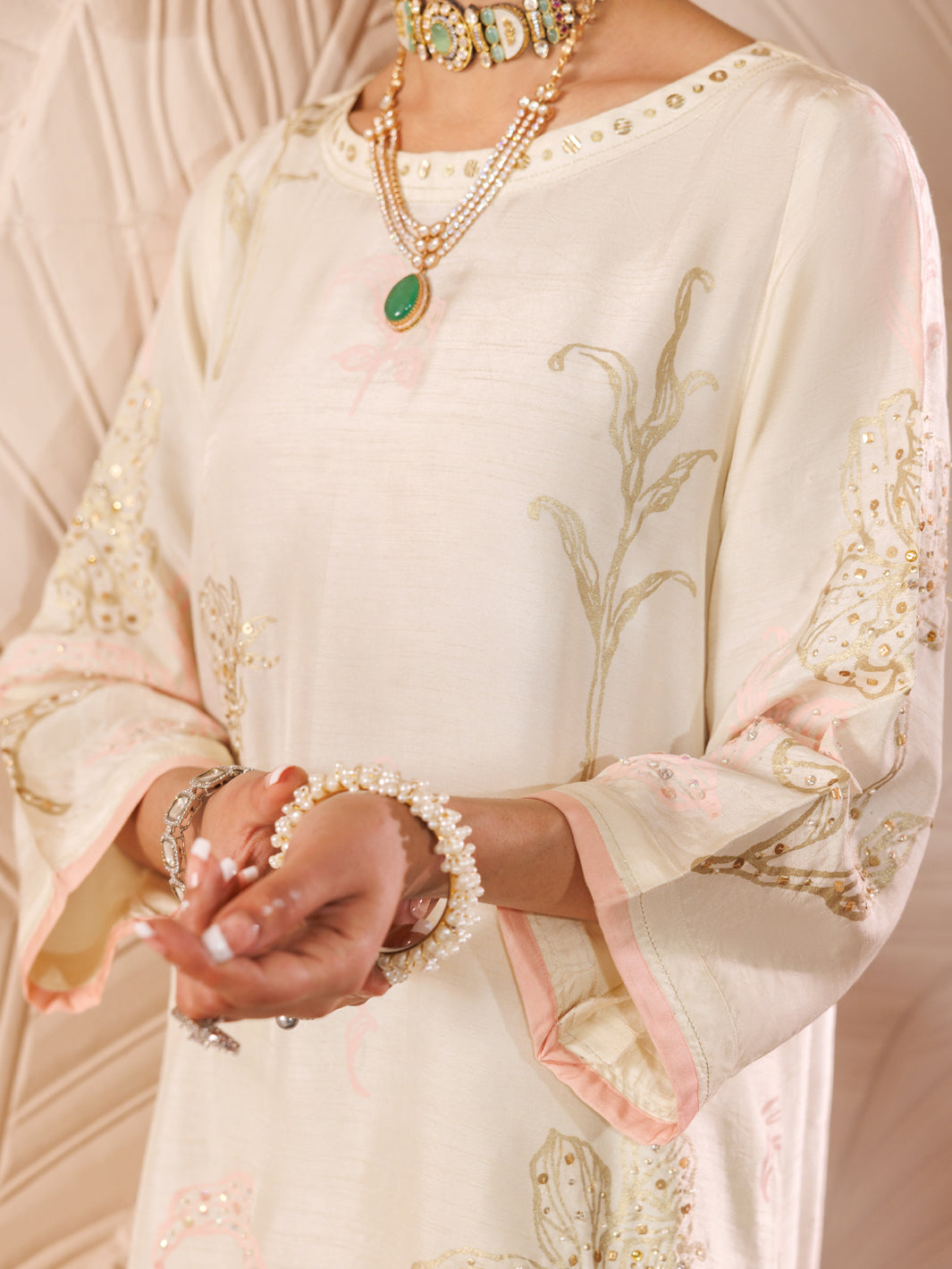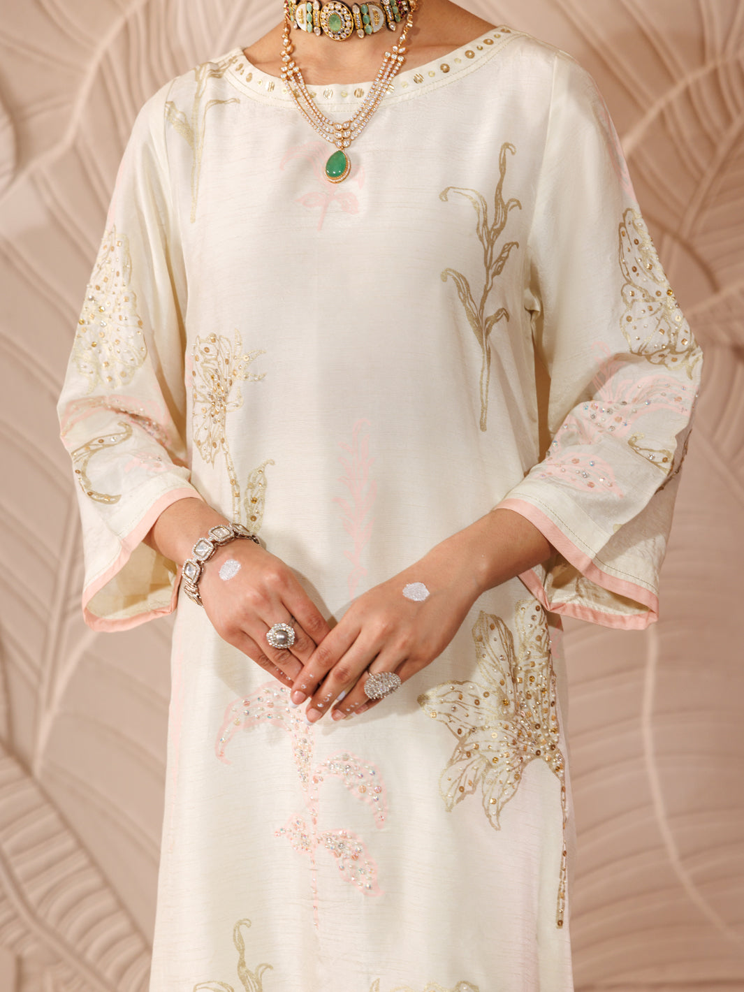 Loose style modal fabric shirt with screen printed asymmetrical print with meticulously embellished on it. Paired with loose culottes pants with embellished details on it.